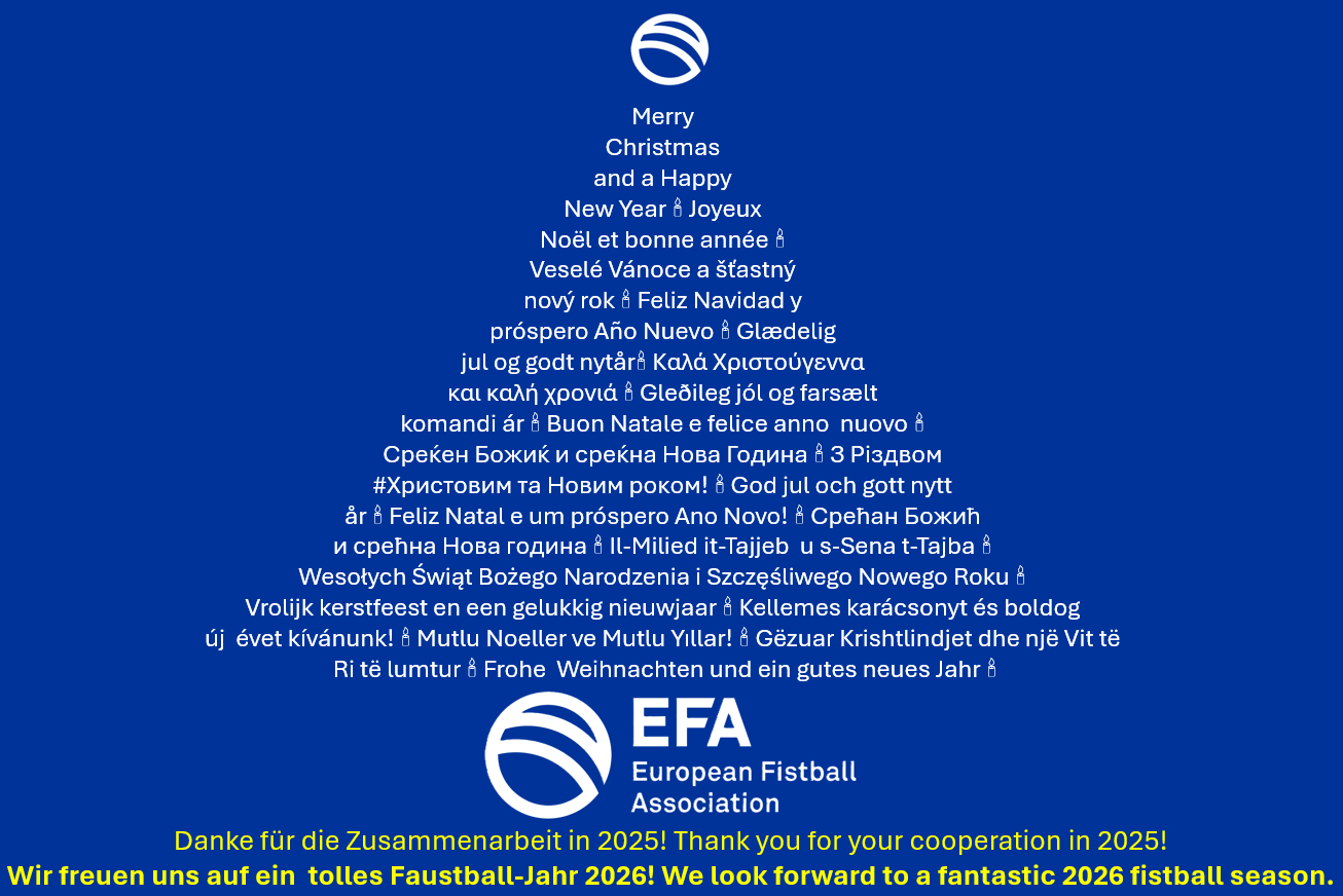Das Präsidium der EFA – European Fistball Association wünscht allen Mitgliedern, den Mitgliedsverbänden, Freunden und Partnern ein frohes Weihnachtsfest und ein gutes neues Jahr. The Board of the EFA – European Fistball Association wishes all members, member associations, friends and partners a Merry Christmas and a Happy New Year.